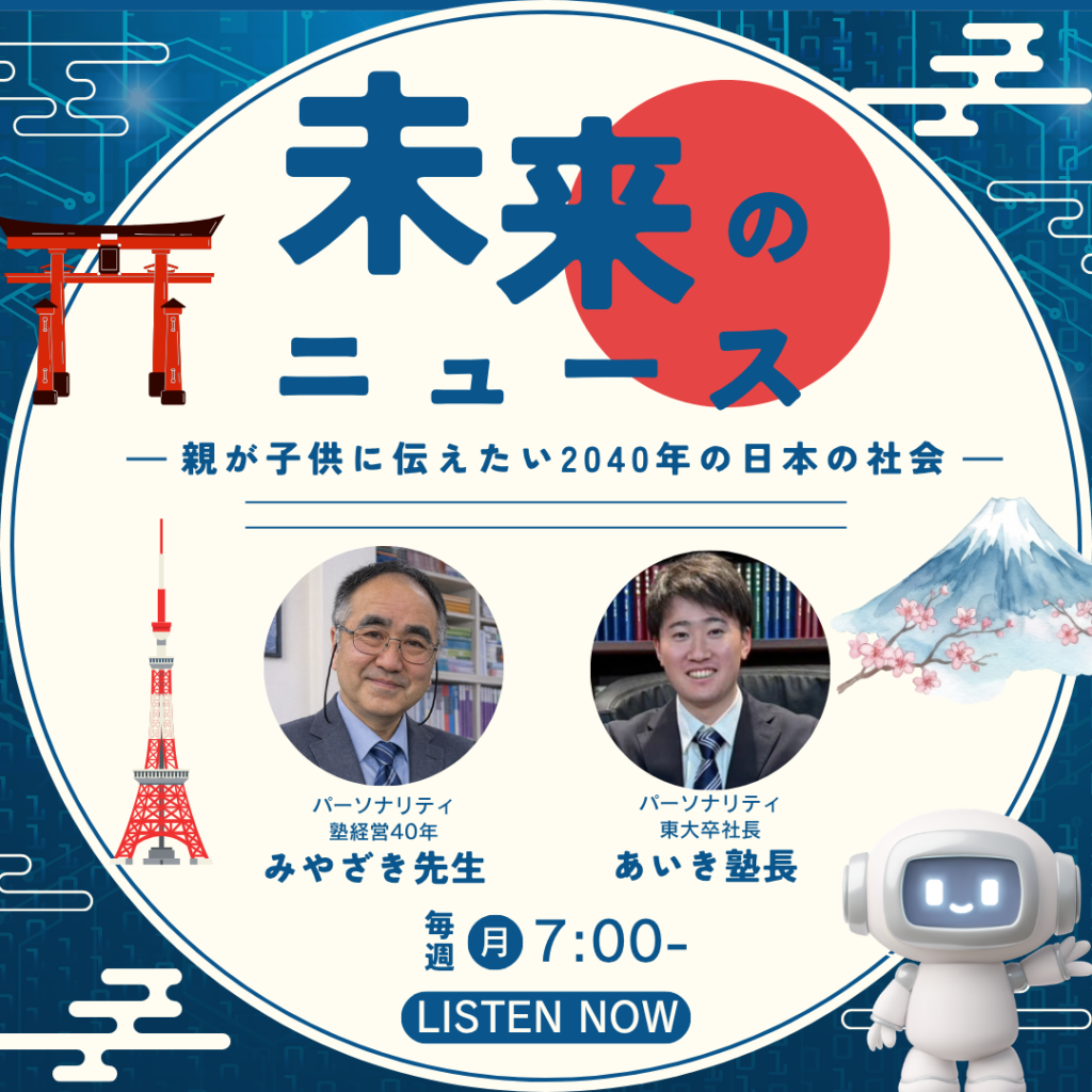 当塾代表、周佐がラジオ番組(ポットキャスト)「未来のニュース -親が子供に伝えたい『2040年の日本の社会』」のパーソナリティに就任しました。